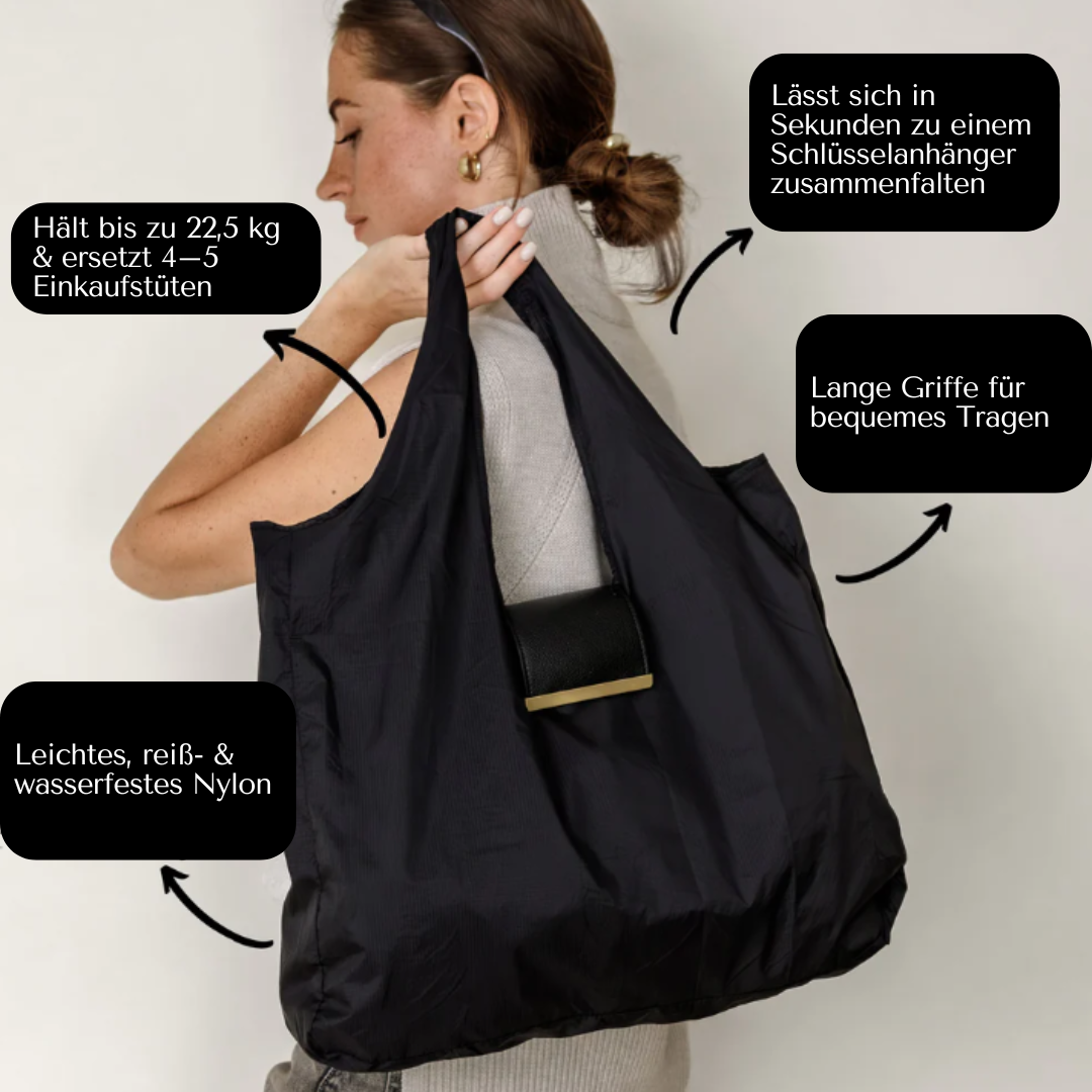 Die KAIRON™ SmartFold Bag passt in jede Handtasche oder Hosentasche. In Sekunden entfaltet sie sich zu einer vollwertigen Einkaufstasche, die bis zu 22,5 kg trägt – perfekt für spontane Einkäufe oder Reisen.